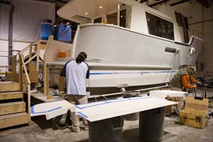 It’s hard to believe how quickly three months will fly by. That’s how long it has been since our new “Kismet” was started and today we were told that if all goes as planned she’ll splash on February 11th – two days ahead of schedule. We continue to be amazed at how many changes occure from one visit to the next. This weeks most noticeable changes were the installation of the rear salon door and window interior teak trim and cabinets, the beautiful granite countertop, in the galley, as well as the start of the rub rail and swim platform installation.