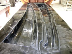 Left: Here is a great shot of a mold that has wax applied to it. The wax helps release the finished product when complete. The two-pieces, once attached, will form the mast.Right: Here you see the mold that has been bagged, being prepared to have the resin inserted – when you turn this piece inside out it will become the salon/galley floor.